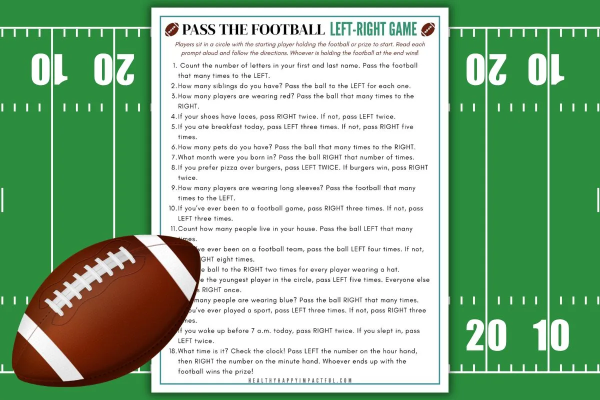 Instead of just sitting on the couch waiting for commercials, everyone gets in on the action. You’ll read fun cues, follow the directions, and pass the football LEFT or RIGHT. Kids, adults, football superfans, and people who only came for the queso can all play.